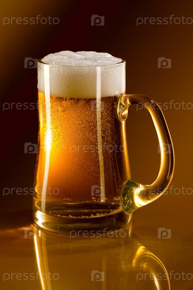 Кружка, полная пива, на золотом фоне с отражением в стекле
