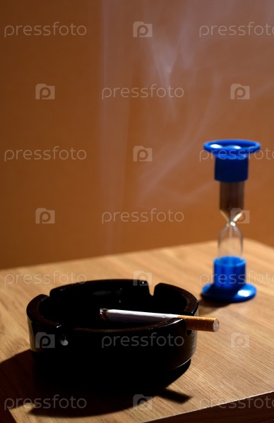 Пепельница с сигаретой и песочные часы крупным планом в студии