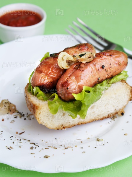 Аппетитный бутерброд с жареными сосисками и печеным луком