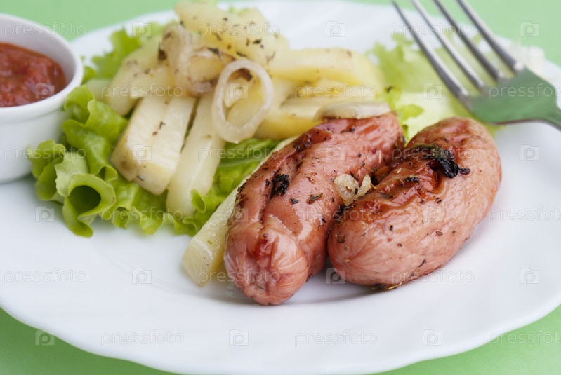 Аппетитные жареные сосиски в картофелем фри и острым томатным соусом