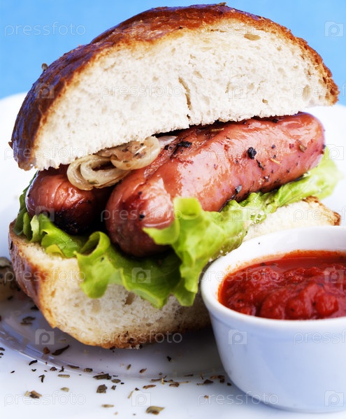 Аппетитный бутерброд с жареными сосисками и печеным луком