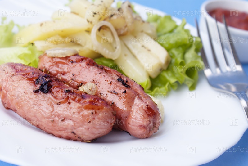 Аппетитные жареные сосиски в картофелем фри и острым томатным соусом