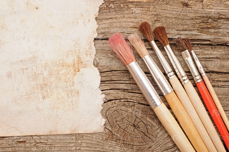 Кисти и старая бумага на деревянном фоне