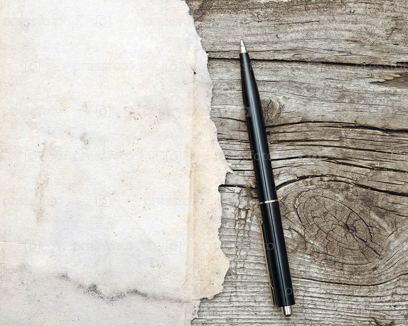 Ручка и старая бумага на деревянном столе