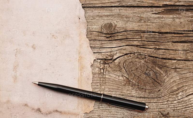 Ручка и старая бумага на деревянном столе