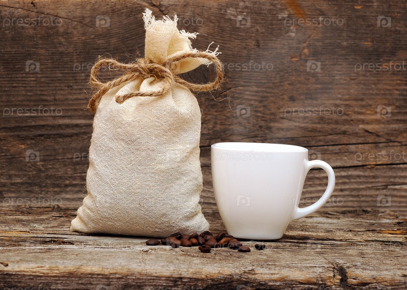 Кофе в зернах, чашка и холщовый мешок на деревянном фоне