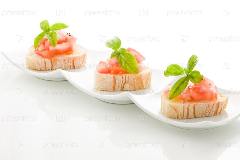 Брускетта с помидорами и базиликом, изолированная на белом фоне