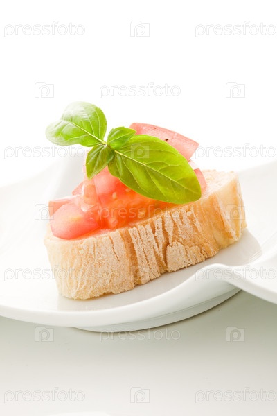 Брускетта с помидорами и базиликом, изолированная на белом фоне