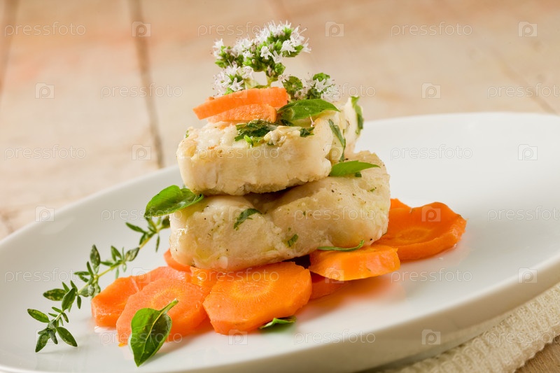 Треска на моркови со свежим орегано и базиликом