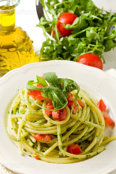 Макароны с соусом песто с рукколой и помидорами черри
