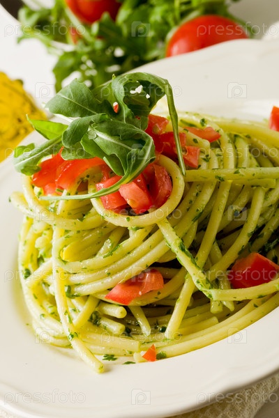 Макароны с соусом песто с рукколой и помидорами черри