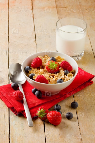 Кукурузные хлопья с ягодами на деревянном столе