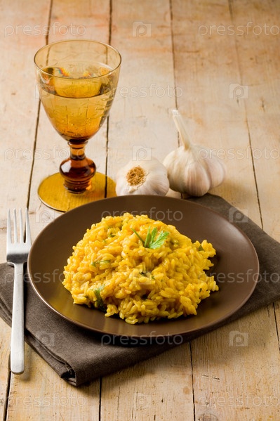 Ризотто с шафраном на деревянном столе