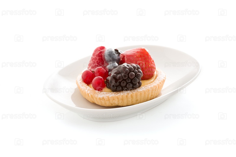 Пирожное с ягодами на белом фоне