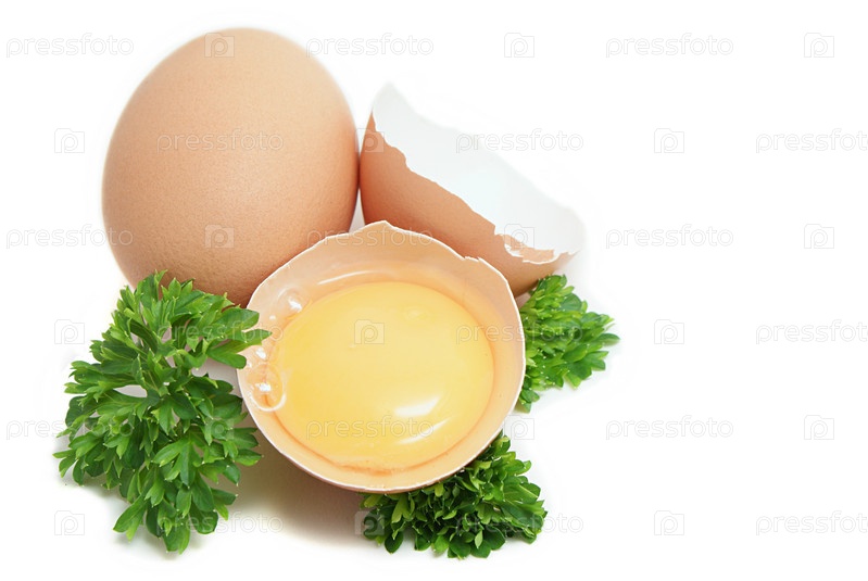 Сырые яйца с петрушкой на белом фоне