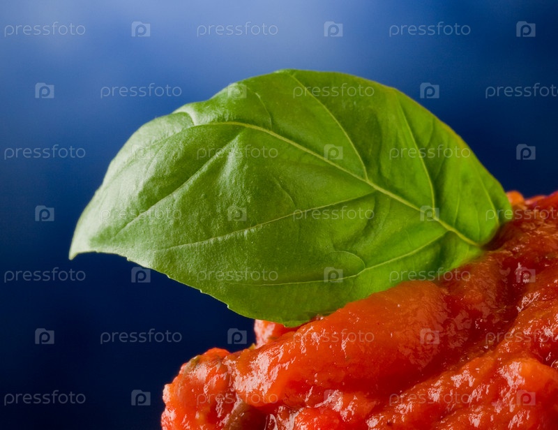 Макароны с томатным соусом и базиликом на синем фоне