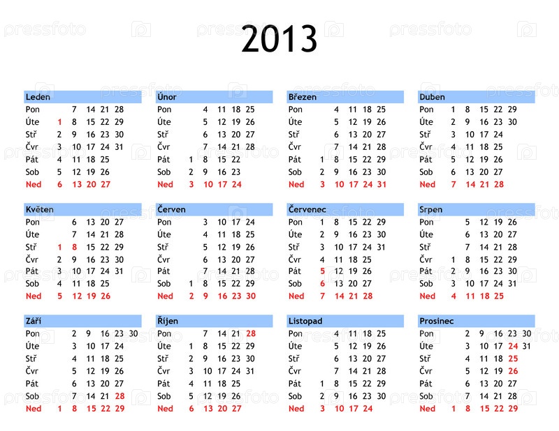 Календарь на 2013 год на чешском языке - с государственными праздниками и выходными банковскими днями Чешской Республики
