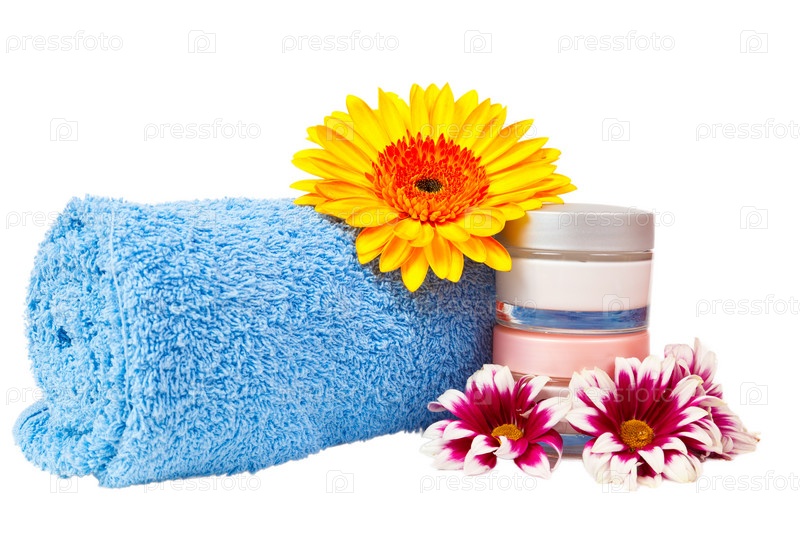 Синее полотенце, крем, герберы