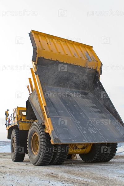 Большой желтый карьерный самосвал на рабочем месте