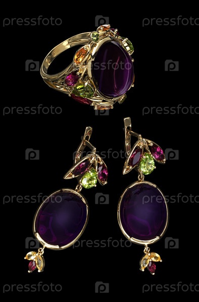 Комплект из кольца и двух серег, изолированный на черном фоне