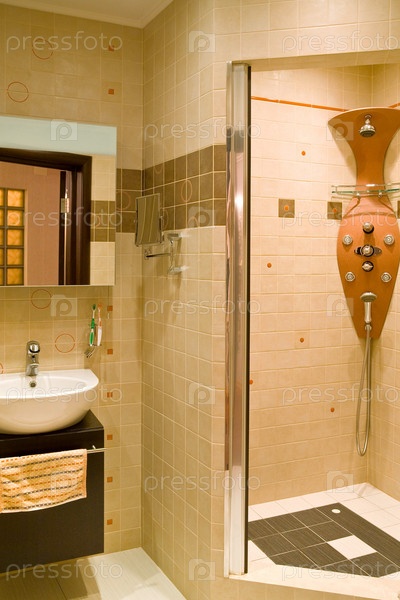 Современный душ и раковина в пастельных тонах
