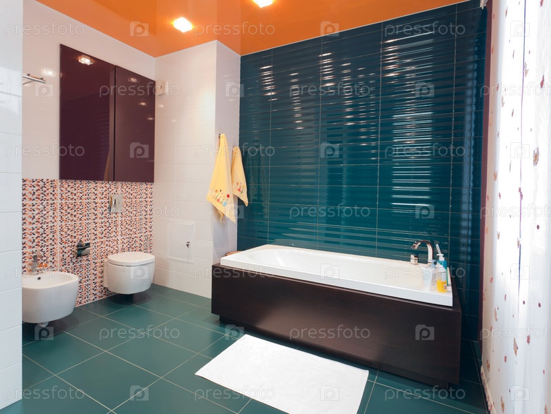 Современная ванная комната в зелено-оранжевых тонах