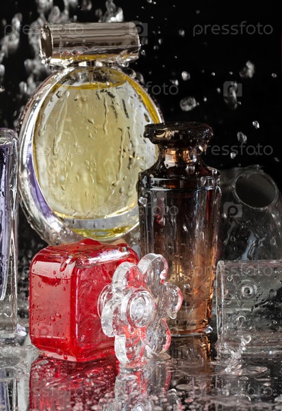 Духи на черном фоне с каплями воды и отражением