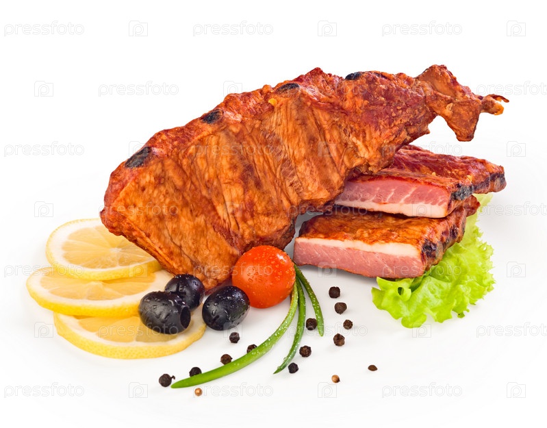 Копченые свиные ребрышки с овощами на белом фоне