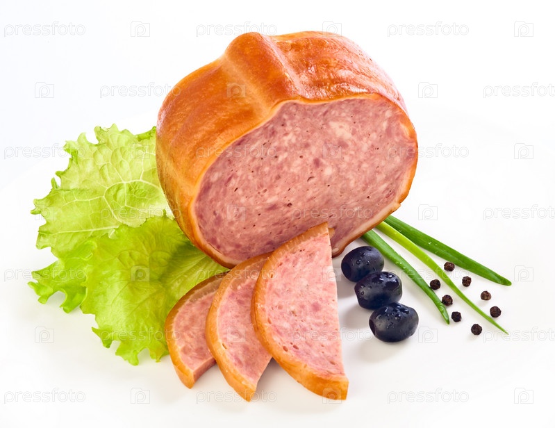 Колбасные изделия и овощи на белом фоне