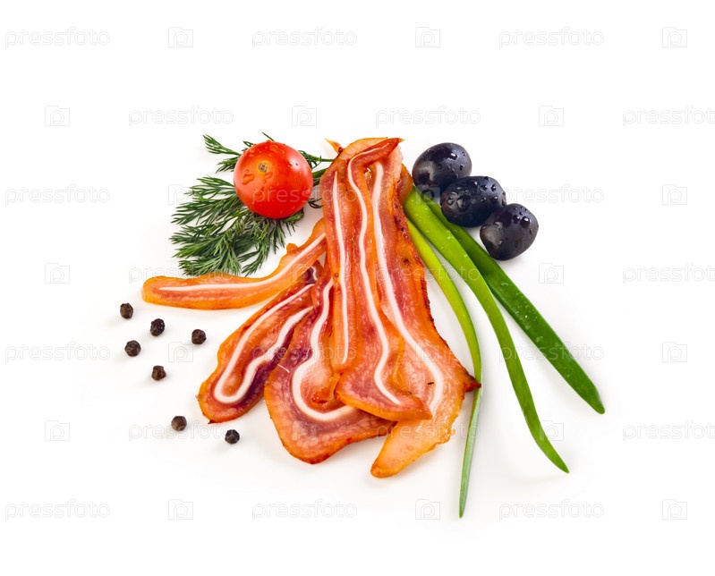 Копченые свиные уши с овощами на белом фоне