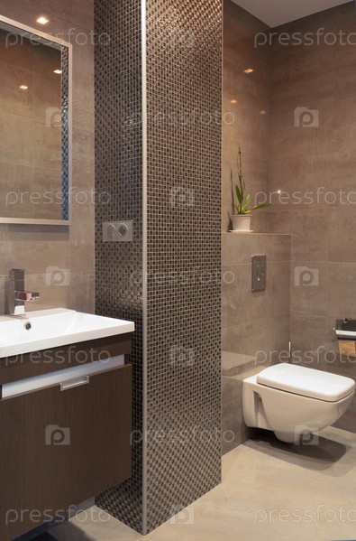 Современная ванная комната с колонной, выложенной мозаикой