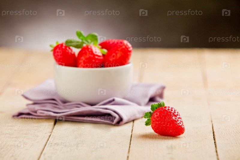 Клубника и сиреневая салфетка на деревянном столе