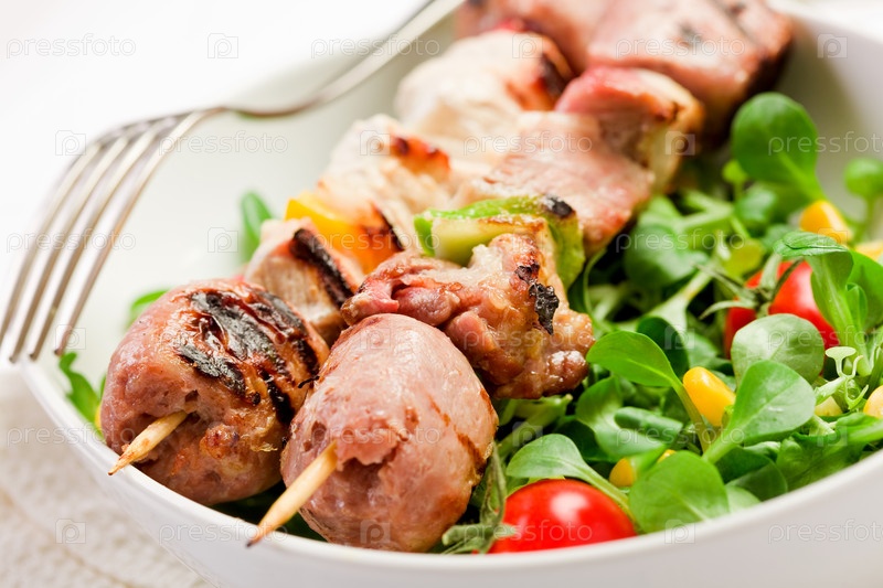 Мясной шашлык на деревянном столе