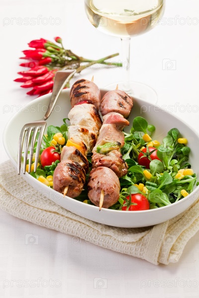 Мясной шашлык на деревянном столе