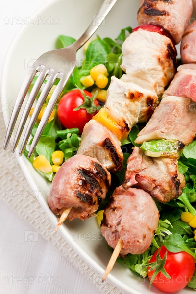 Мясной шашлык на деревянном столе