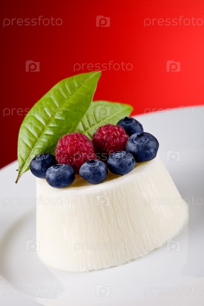 Панна котта с ягодами на красном фоне