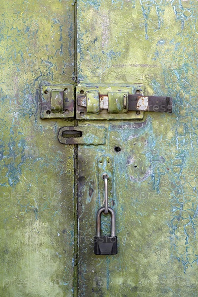 Старая железная дверь с замком и щеколдой