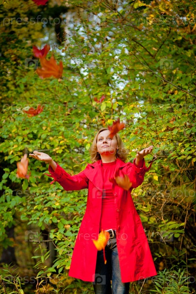 Счастливая женщина играет с осенними листьями в осеннем лесу