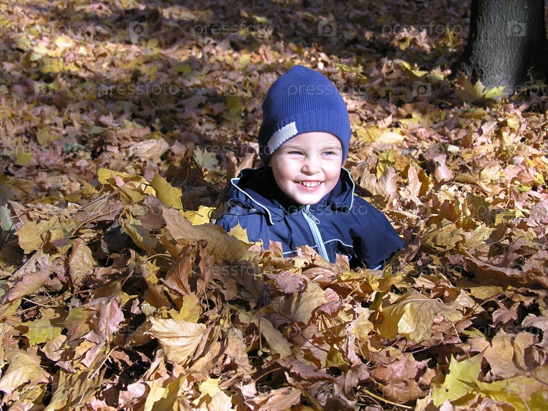 Мальчик в кленовых осенних листьях