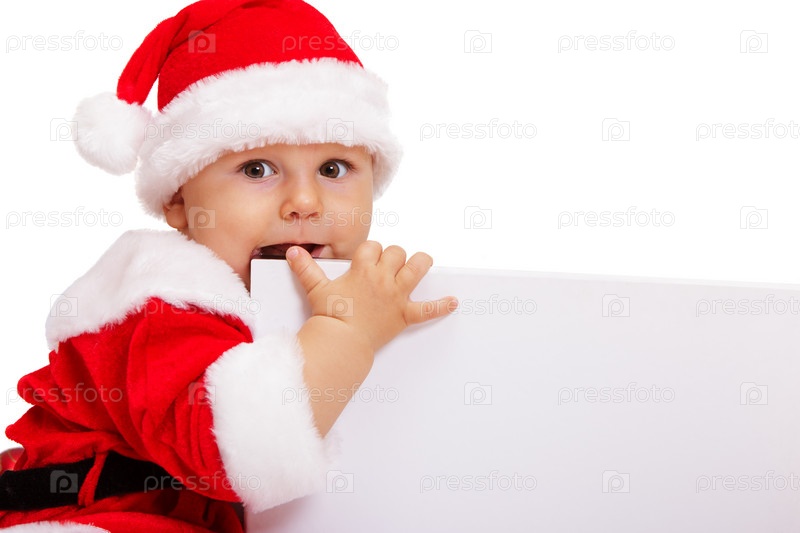Красивый мальчик в колпаке Санты грызет угол баннера