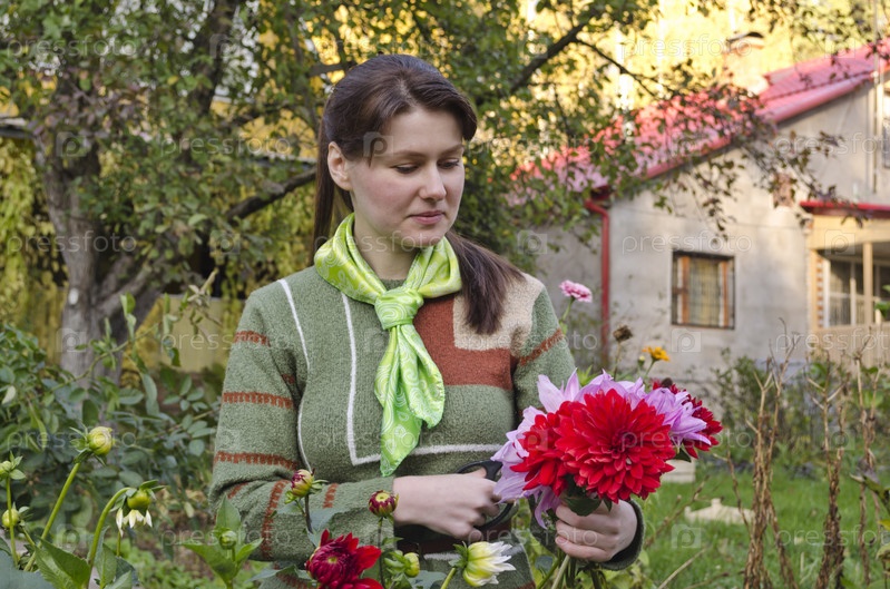 Молодая женщина режет георгины в осеннем саду