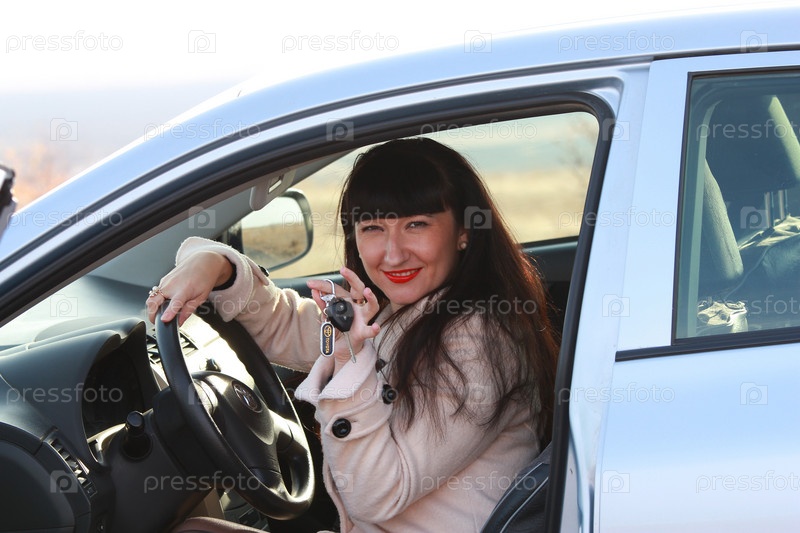 Счастливая женщина за рулем автомобиля показывает ключ