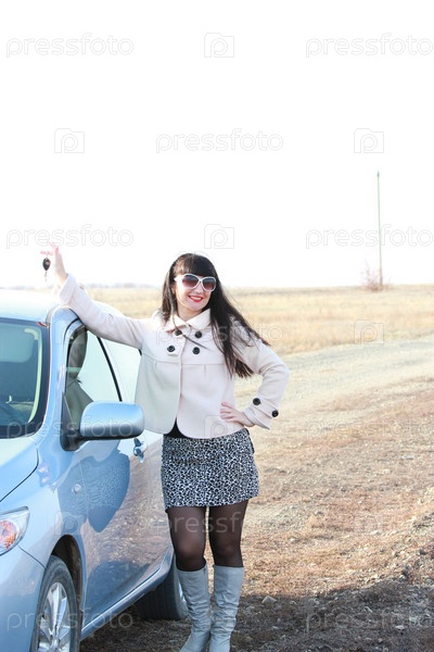 Девушка в солнечных очках с ключом в руке возле автомобиля