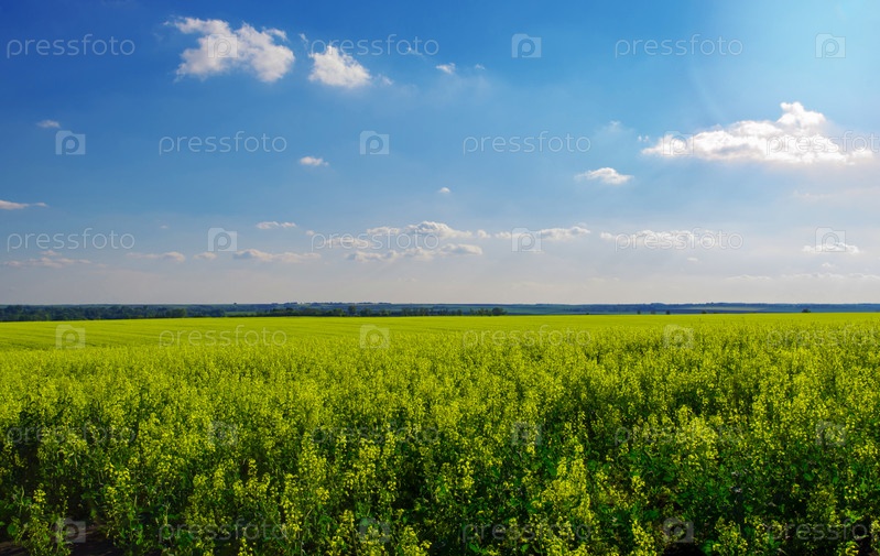 Живописное поле с цветущим рапсом и синее небо