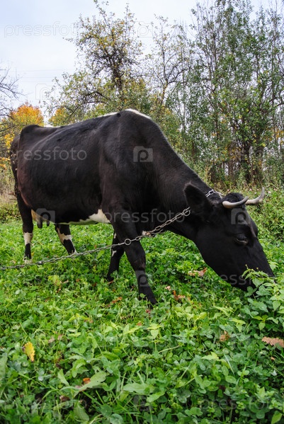 Черная корова, пасущаяся на клеверном лугу