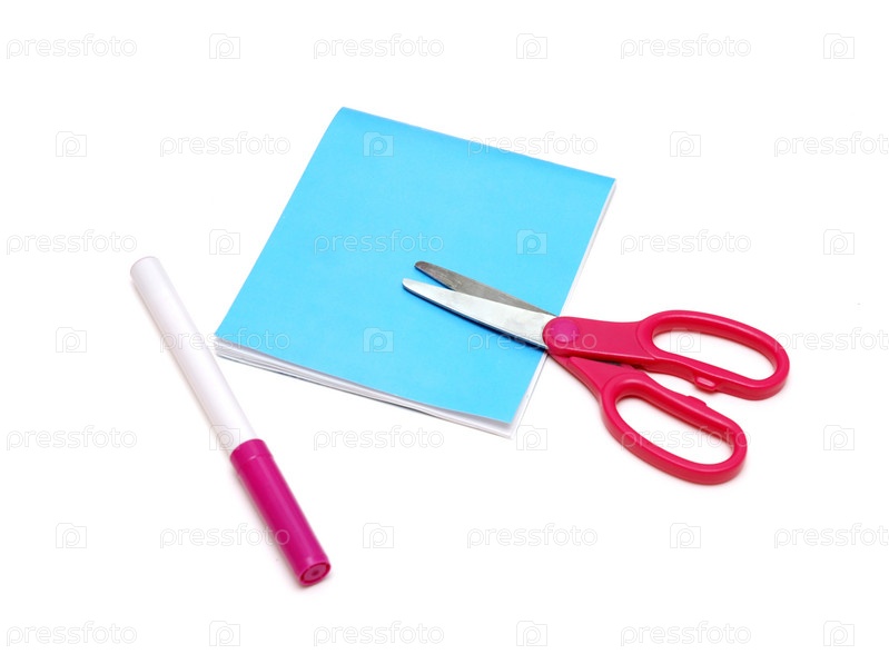 Блокнот, ножницы и фломастер на белом фоне