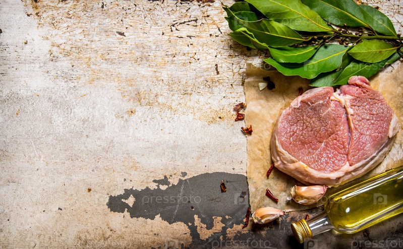 Сырье свежее мясо с чесноком и маслом на деревянной доске