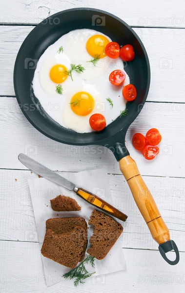 Жареные яйца, укроп и свежие помидоры в сковороде