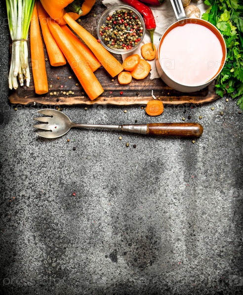 Свежие овощи с пряностями, травами и морковным соком