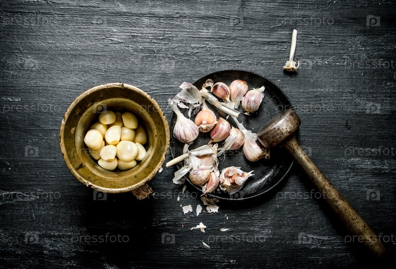 Свежий чеснок и ступка с пестиком